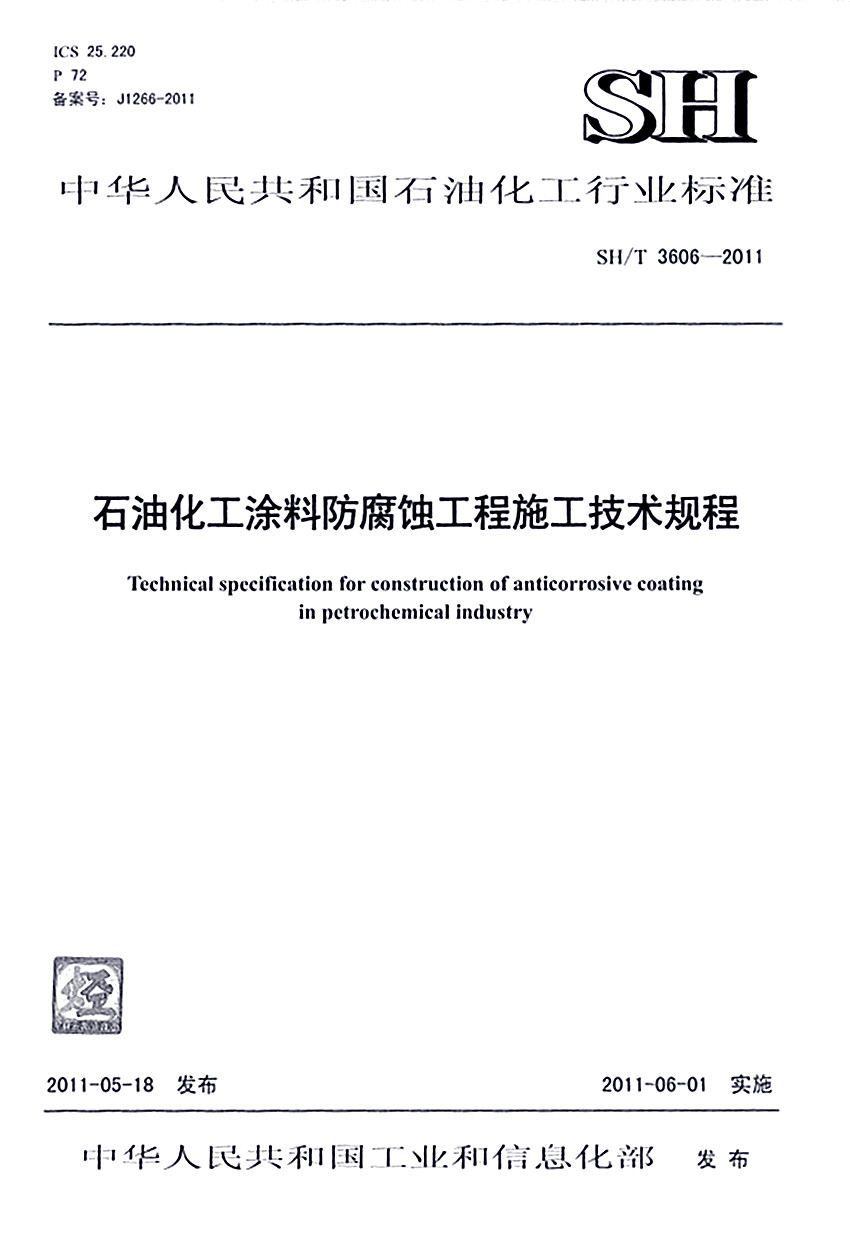石油化工涂料防腐蝕工程施工技術(shù)規(guī)程標(biāo)準(zhǔn)SH/T 3606-2011 ICS25.220 P72 備案號(hào):J1266-2011 SH 中華人民共和國(guó)石油化工行業(yè)標(biāo)準(zhǔn) SH/T 3606-2011石油化工涂料防腐蝕工程施工技術(shù)規(guī)程 Technical spccificatinon for construction of anticorrosive coating in pctrochcmical in
