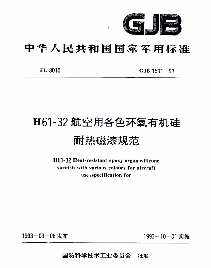 H61-83航空用各色環(huán)氧有機(jī)硅耐熱底漆規(guī)范標(biāo)準(zhǔn)GJB 1592-93 GJB 中華人民共和國(guó)國(guó)家軍用標(biāo)準(zhǔn) FL8010 GJB 1592-93 H61-83航空用各色環(huán)氧有機(jī)硅耐熱底漆規(guī)范 H61-83 Heat-resistant epoxy organosilicnne primer with coating with various colours for aircraft use,sp