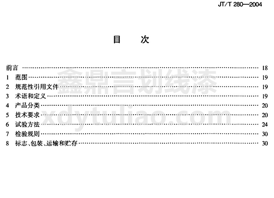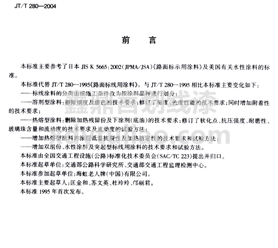 JT/T 280-2004路面標(biāo)線涂料標(biāo)準(zhǔn)是小編照搬JT/T 280-2004《路面標(biāo)線涂料》紙質(zhì)版內(nèi)容,大家可以放心參考。更多防腐涂料執(zhí)行國家和行業(yè)標(biāo)準(zhǔn)等防腐涂料相關(guān)信息可以參與網(wǎng)站:www.cead.org.cn