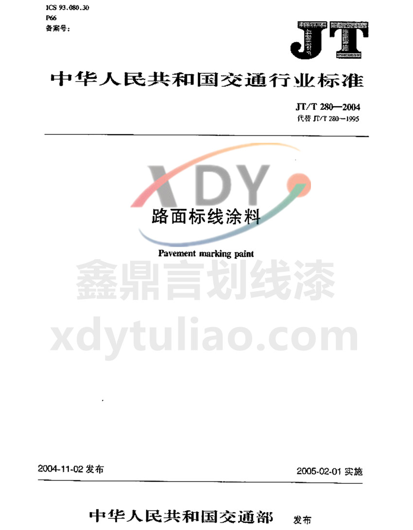 JT/T 280-2004路面標線涂料標準是防腐涂料小編照搬JT/T 280-2004《路面標線涂料》紙質版內容,大家可以放心參考。更多防腐涂料執(zhí)行國家和行業(yè)標準等防腐涂料相關信息可以參考官網:www.cead.org.cn ICS 93.080.30 P66 JT 中華人民共和國交通運輸行業(yè)標準 JT/T 280-2004路面標線涂料Pavement